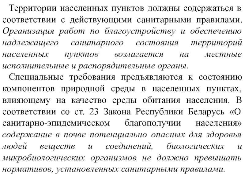 Специальные требования предъявляются к состоянию компонентов природной среды в населенных пунктах, влияющему на качество среды обитания населения. В соответствии со ст. 23 Закона Республики Беларусь «О санитарно-эпидемическом благополучии населения» содержание в почве потенциально опасных для здоровья людей веществ и соединений, биологических и микробиологических организмов не должно превышать нормативов, установленных санитарными правилами.