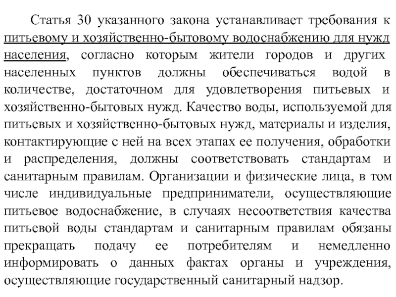 и других населенных пунктов должны обеспечиваться водой в количестве, достаточном для удовлетворения питьевых и хозяйственно-бытовых нужд. Качество воды, используемой для питьевых и хозяйственно-бытовых нужд, материалы и изделия, контактирующие с ней на всех этапах ее получения, обработки и распределения, должны соответствовать стандартам и санитарным правилам. Организации и физические лица, в том числе индивидуальные предприниматели, осуществляющие питьевое водоснабжение, в случаях несоответствия качества питьевой воды стандартам и санитарным правилам обязаны прекращать подачу ее потребителям и немедленно информировать о данных фактах органы и учреждения, осуществляющие государственный санитарный надзор.