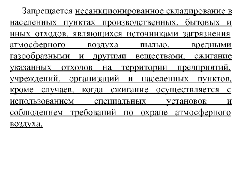 вредными газообразными и другими веществами, сжигание указанных отходов на территории предприятий, учреждений, организаций и населенных пунктов, кроме случаев, когда сжигание осуществляется с использованием специальных установок и соблюдением требований по охране атмосферного воздуха.