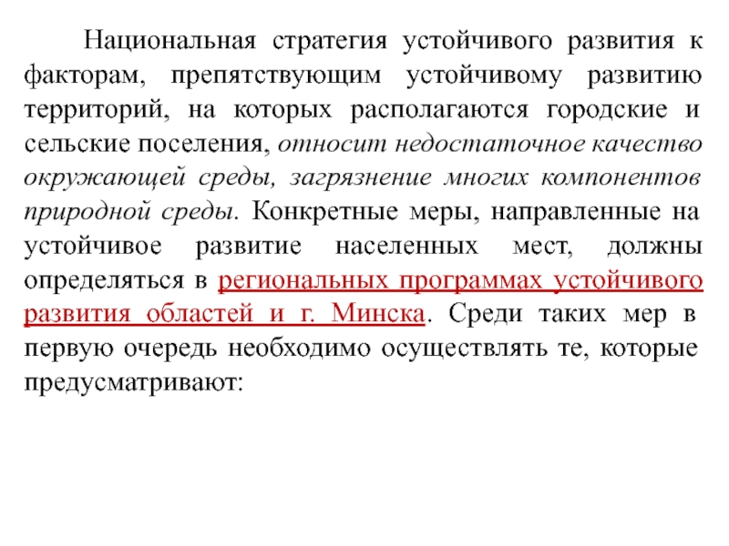 устойчивое развитие населенных мест, должны определяться в региональных программах устойчивого развития областей и г. Минска. Среди таких мер в первую очередь необходимо осуществлять те, которые предусматривают:
