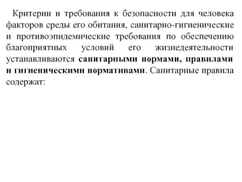 жизнедеятельности устанавливаются санитарными нормами, правилами и гигиеническими нормативами. Санитарные правила содержат: