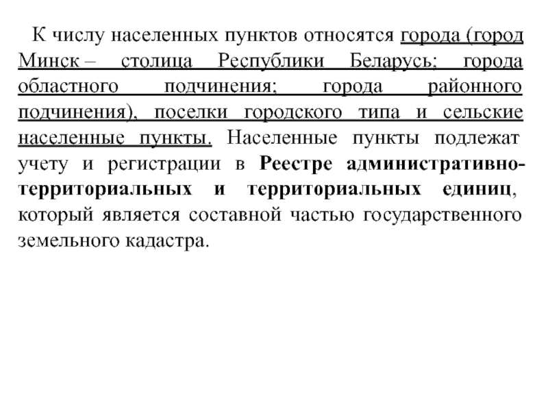 и сельские населенные пункты. Населенные пункты подлежат учету и регистрации в Реестре административно-территориальных и территориальных единиц, который является составной частью государственного земельного кадастра.