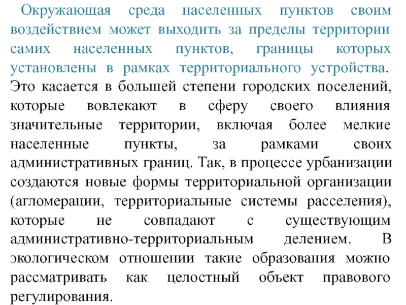 устройства. Это касается в большей степени городских поселений, которые вовлекают в сферу своего влияния значительные территории, включая более мелкие населенные пункты, за рамками своих административных границ. Так, в процессе урбанизации создаются новые формы территориальной организации (агломерации, территориальные системы расселения), которые не совпадают с существующим административно-территориальным делением. В экологическом отношении такие образования можно рассматривать как целостный объект правового регулирования.