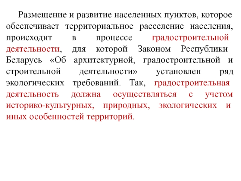 центрами территориального расселения людей, и предусматривает правовые меры охраны окружающей среды населенных пунктов в процессе территориальной организации Республики Беларусь, планировки и застройки населенных пунктов, которые закреплены в законодательстве об архитектурной, градостроительной и строительной деятельности;