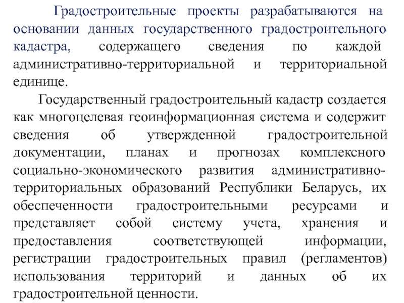 «Об охране окружающей среды» и законодательством об архитектурной, градостроительной и строительной деятельности. Содержание этих требований имеет два взаимоувязанных аспекта: размещение и развитие как населенных пунктов в системе территориальной организации Республики Беларусь, так и каждого отдельного населенного пункта в процессе его планировки и застройки.