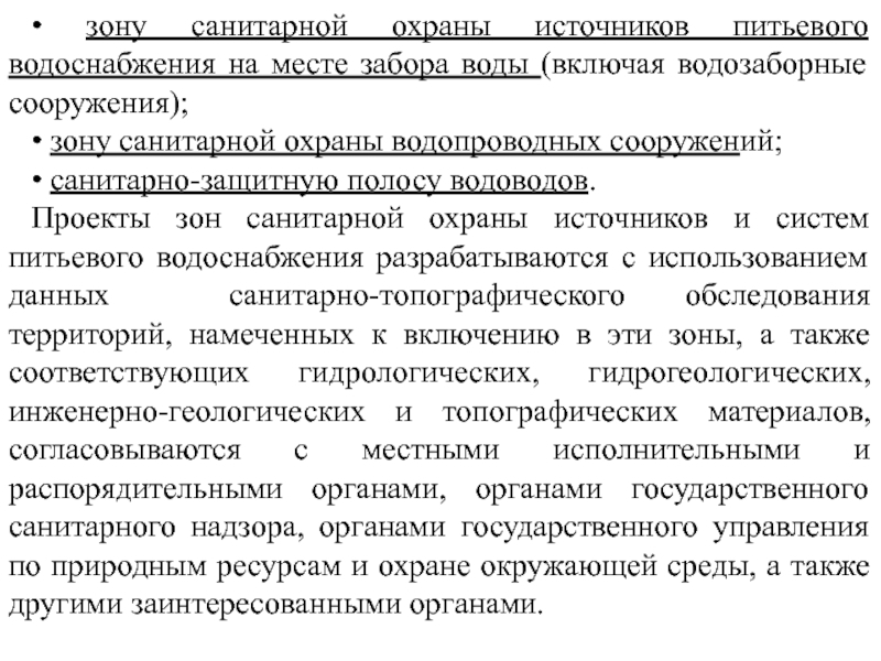 Проекты зон санитарной охраны источников и систем питьевого водоснабжения разрабатываются с использованием данных санитарно-топографического обследования территорий, намеченных к включению в эти зоны, а также соответствующих гидрологических, гидрогеологических, инженерно-геологических и топографических материалов, согласовываются с местными исполнительными и распорядительными органами, органами государственного санитарного надзора, органами государственного управления по природным ресурсам и охране окружающей среды, а также другими заинтересованными органами.