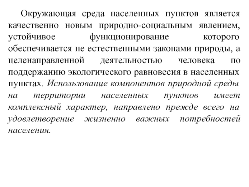 человека по поддержанию экологического равновесия в населенных пунктах. Использование компонентов природной среды на территории населенных пунктов имеет комплексный характер, направлено прежде всего на удовлетворение жизненно важных потребностей населения.