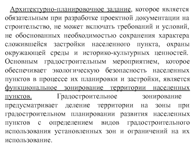 и их защиты от чрезвычайных ситуаций природного и техногенного характера при разработке градостроительной и проектной документации на строительство и застройку населенных пунктов. Также при осуществлении архитектурной, градостроительной и строительной деятельности должно обеспечиваться соблюдение требований в области сохранения недвижимых материальных историко-культурных ценностей и охраны особо охраняемых природных территорий.