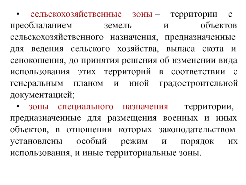 Слайд 41• сельскохозяйственные зоны – территории с преобладанием земель и объектов сельскохозяйственного