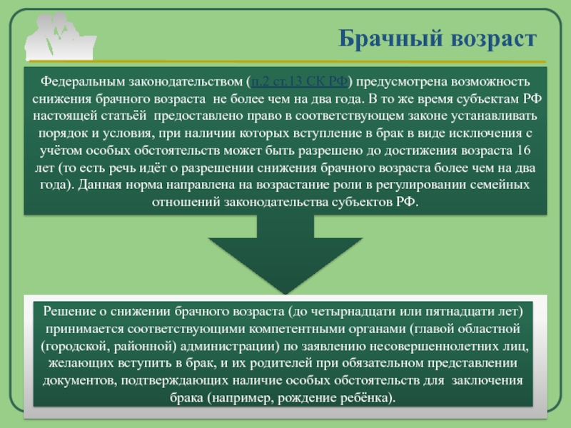 Company Logowww.themegallery.comБрачный возрастФедеральным законодательством (п.2 ст.13 СК РФ) предусмотрена возможность снижения брачного возраста не более чем на