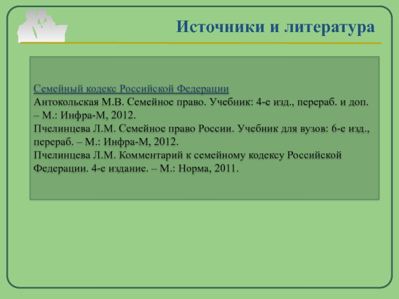 Пчелинцева Л.М. Комментарий к семейному кодексу Российской Федерации. 4-е издание. – М.: Норма, 2011.