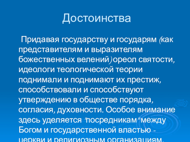 средние века эта теория служила обоснованием абсолютной ("отеческой") власти монарха. Положения этой теории развивал и китайский ученый Конфуций.