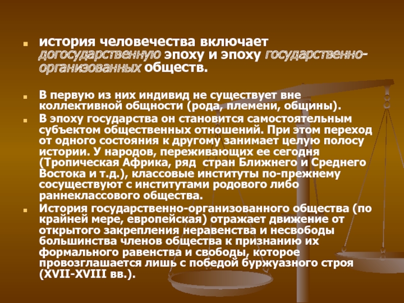 История государственно-организованного общества (по крайней мере, европейская) отражает движение от открытого закрепления неравенства и несвободы большинства членов общества к признанию их формального равенства и свободы, которое провозглашается лишь с победой буржуазного строя (XVII-XVIII вв.).