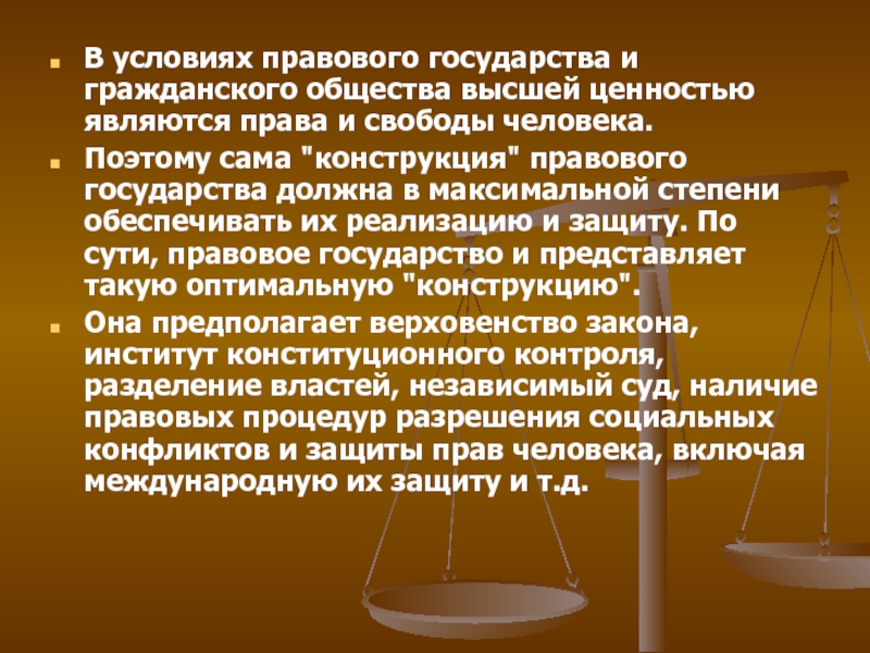 в максимальной степени обеспечивать их реализацию и защиту. По сути, правовое государство и представляет такую оптимальную "конструкцию".