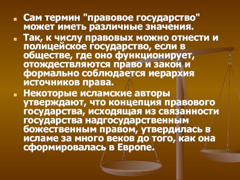 Некоторые исламские авторы утверждают, что концепция правового государства, исходящая из связанности государства надгосударственным божественным правом, утвердилась в исламе за много веков до того, как она сформировалась в Европе.