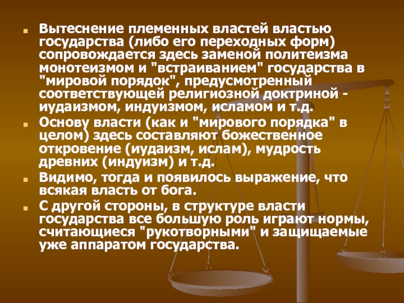 Так, в раннеклассовую эпоху оно охраняет божественный "мировой порядок" и в силу этого находится ближе к Богу, чем остальное общество.