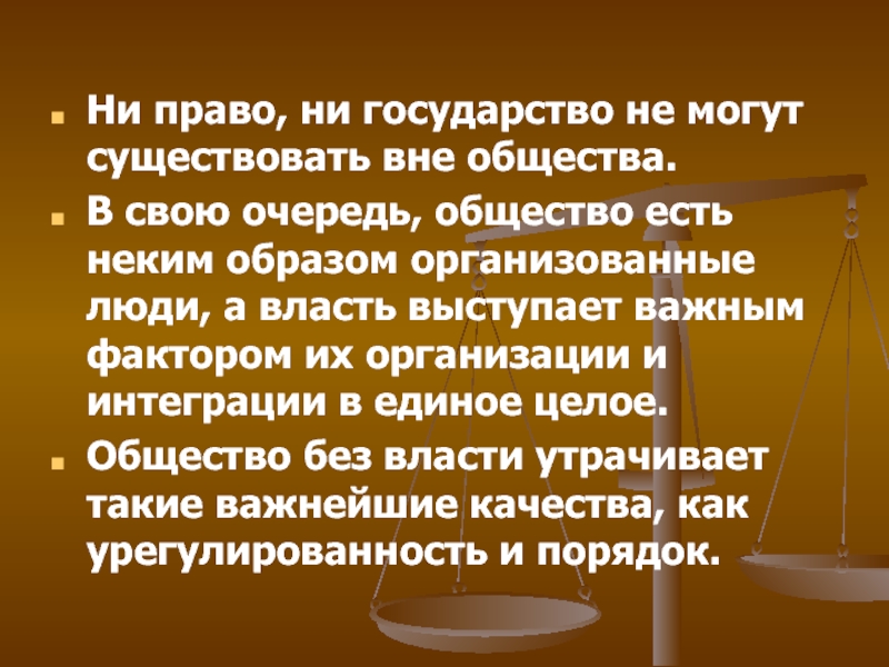 Слайд 4Ни право, ни государство не могут существовать вне общества.