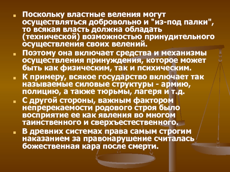 всякая власть должна обладать (технической) возможностью принудительного осуществления своих велений.