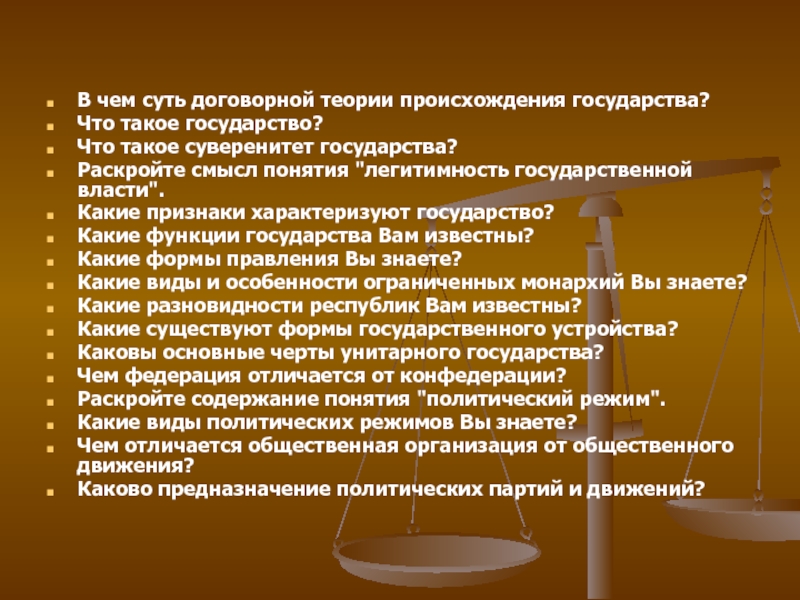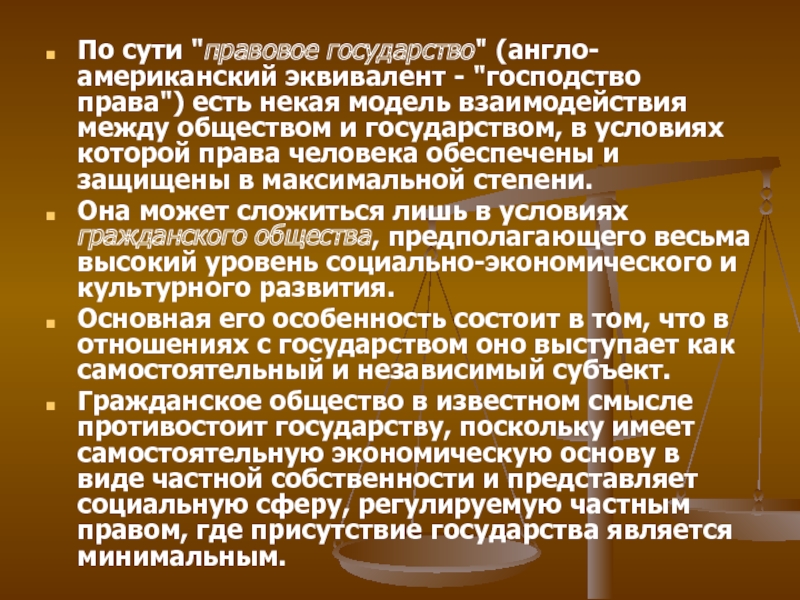 Государство, выступающее в таком качестве, должно соответствовать неким демократическим и гуманистическим стандартам, которые в своей совокупности называются правовым государством.