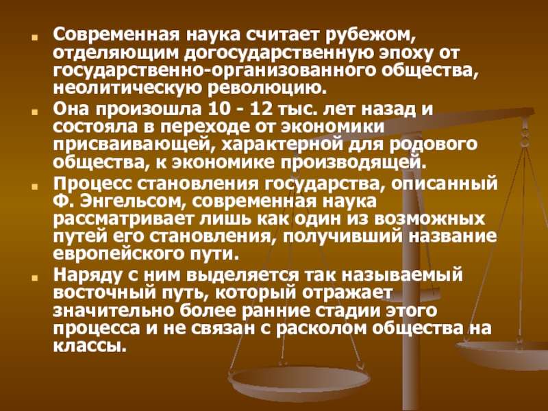 В эпоху государства он становится самостоятельным субъектом общественных отношений. При этом переход от одного состояния к другому занимает целую полосу истории. У народов, переживающих ее сегодня (Тропическая Африка, ряд стран Ближнего и Среднего Востока и т.д.), классовые институты по-прежнему сосуществуют с институтами родового либо раннеклассового общества.