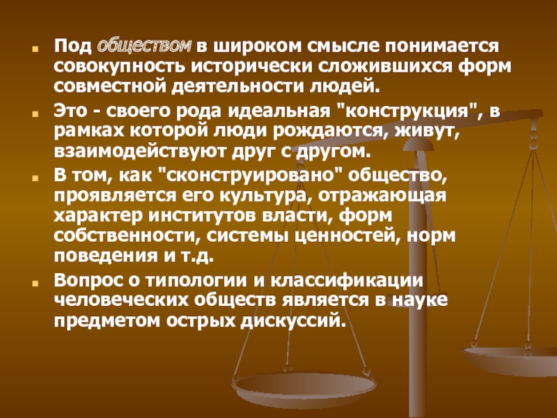 Слайд 5Под обществом в широком смысле понимается совокупность исторически сложившихся форм