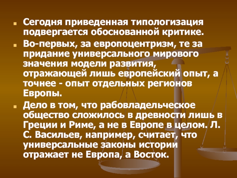 Дело в том, что рабовладельческое общество сложилось в древности лишь в Греции и Риме, а не в Европе в целом. Л.С. Васильев, например, считает, что универсальные законы истории отражает не Европа, а Восток.