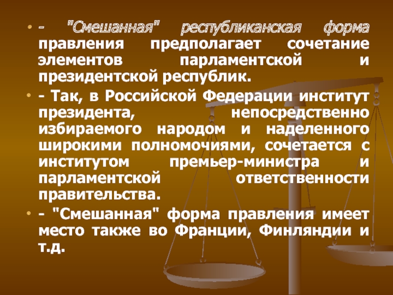 Она предполагает верховенство закона, институт конституционного контроля, разделение властей, независимый суд, наличие правовых процедур разрешения социальных конфликтов и защиты прав человека, включая международную их защиту и т.д.