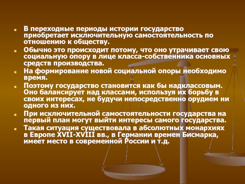 В переходные периоды истории государство приобретает исключительную самостоятельность по отношению