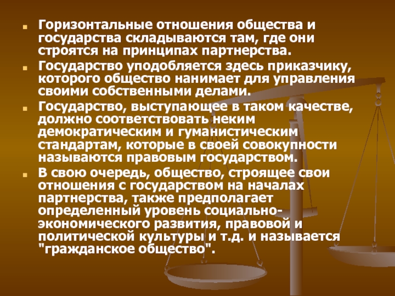 В свою очередь, общество, строящее свои отношения с государством на началах партнерства, также предполагает определенный уровень социально-экономического развития, правовой и политической культуры и т.д. и называется "гражданское общество".