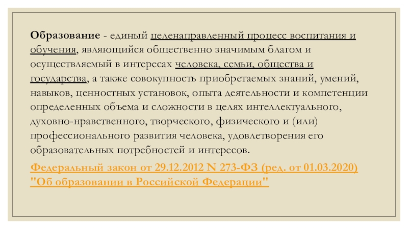 Слайд 5Образование - единый целенаправленный процесс воспитания и обучения, являющийся общественно