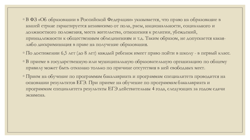 независимо от _____, расы, национальности, социального и должностного положения. Таким образом, не допускается какая-либо ________ в праве на получение образования. По достижении 6,5 лет (до 8 лет) каждый ребенок имеет право пойти в ________.