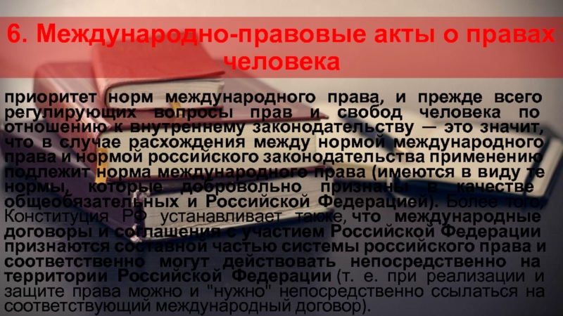 к внутреннему законодательству — это значит, что в случае расхождения между нормой международного права и нормой российского законодательства применению подлежит норма международного права (имеются в виду те нормы, которые добровольно признаны в качестве общеобязательных и Российской Федерацией). Более того, Конституция РФ устанавливает также, что международные договоры и соглашения с участием Российской Федерации признаются составной частью системы российского права и соответственно могут действовать непосредственно на территории Российской Федерации (т. е. при реализации и защите права можно и "нужно" непосредственно ссылаться на соответствующий международный договор).
