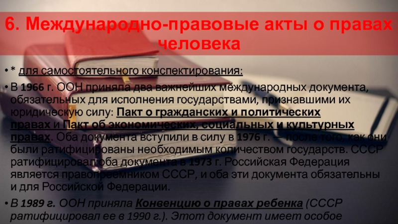 их юридическую силу: Пакт о гражданских и политических правах и Пакт об экономических, социальных и культурных правах. Оба документа вступили в силу в 1976 г. — после того, как они были ратифицированы необходимым количеством государств. СССР ратифицировал оба документа в 1973 г. Российская Федерация является правопреемником СССР, и оба эти документа обязательны и для Российской Федерации.