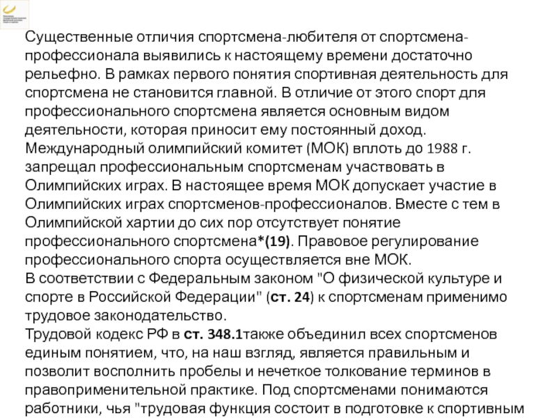 Международный олимпийский комитет (МОК) вплоть до 1988 г. запрещал профессиональным спортсменам участвовать в Олимпийских играх. В настоящее время МОК допускает участие в Олимпийских играх спортсменов-профессионалов. Вместе с тем в Олимпийской хартии до сих пор отсутствует понятие профессионального спортсмена*(19). Правовое регулирование профессионального спорта осуществляется вне МОК.