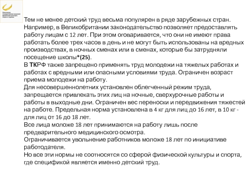 Но все эти нормы не соотносятся со сферой физической культуры и спорта, где спецификой является именно детский труд.