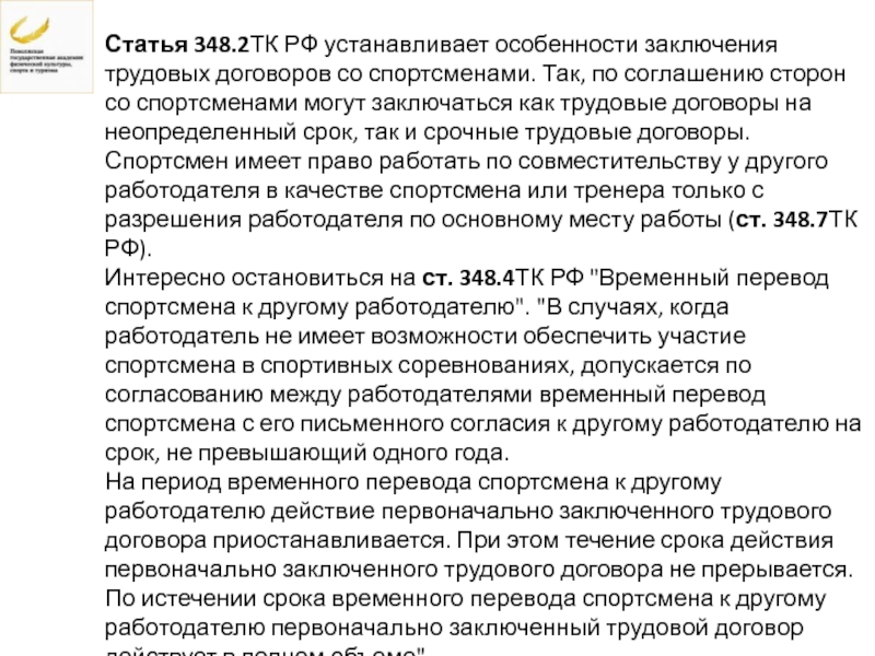 Слайд 10Статья 348.2ТК РФ устанавливает особенности заключения трудовых договоров со спортсменами.