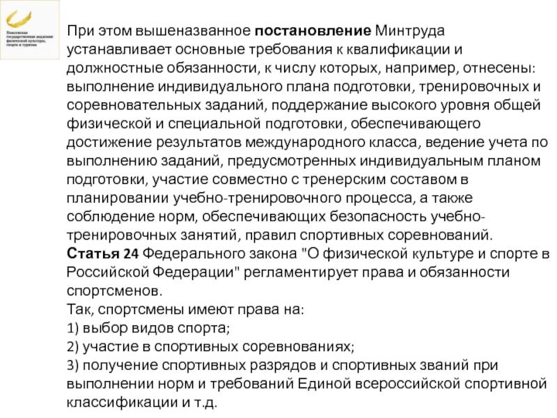 Слайд 8При этом вышеназванное постановление Минтруда устанавливает основные требования к квалификации и