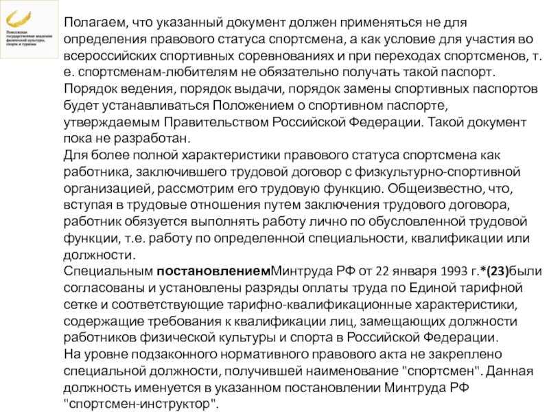 специальный правовой статус спортсменов. Например, в соответствии с Положением по