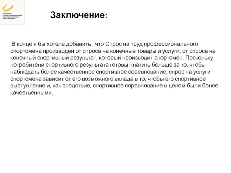 услуги, от спроса на конечный спортивный результат, который производит спортсмен. Поскольку потребители спортивного результата готовы платить больше за то, чтобы наблюдать более качественное спортивное соревнование, спрос на услуги спортсмена зависит от его возможного вклада в то, чтобы его спортивное выступление и, как следствие, спортивное соревнование в целом были более качественными.