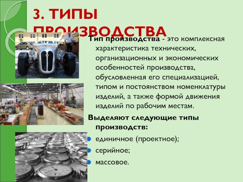 3. ТИПЫ ПРОИЗВОДСТВАТип производства - это комплексная характеристика технических, организационных и экономических особенностей производства, обусловленная его специализацией, типом