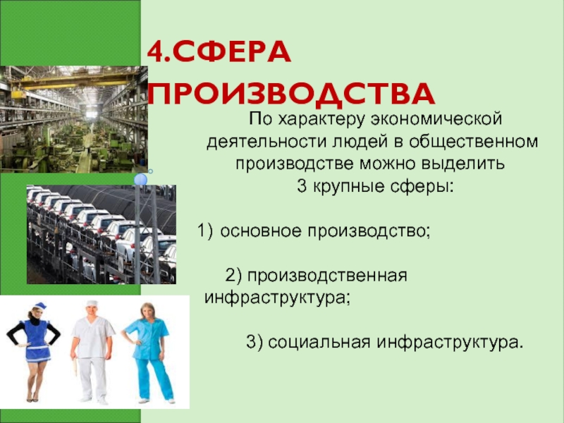 4.Сфера производстваПо характеру экономической деятельности людей в общественном производстве можно выделить 3 крупные сферы: основное производство;