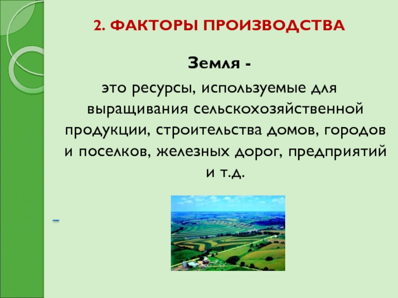2. ФАКТОРЫ ПРОИЗВОДСТВА  Земля -это ресурсы, используемые для выращивания сельскохозяйственной продукции, строительства домов, городов и