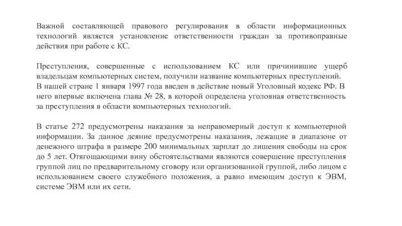 В нашей стране 1 января 1997 года введен в действие новый Уголовный кодекс РФ. В него впервые включена глава № 28, в которой определена уголовная ответственность за преступления в области компьютерных технологий.