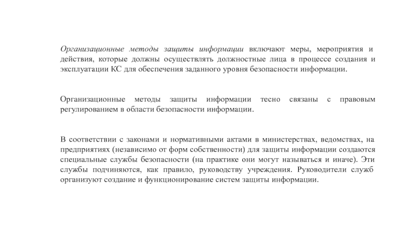 Организационные методы защиты информации тесно связаны с правовым регулированием в области безопасности информации.