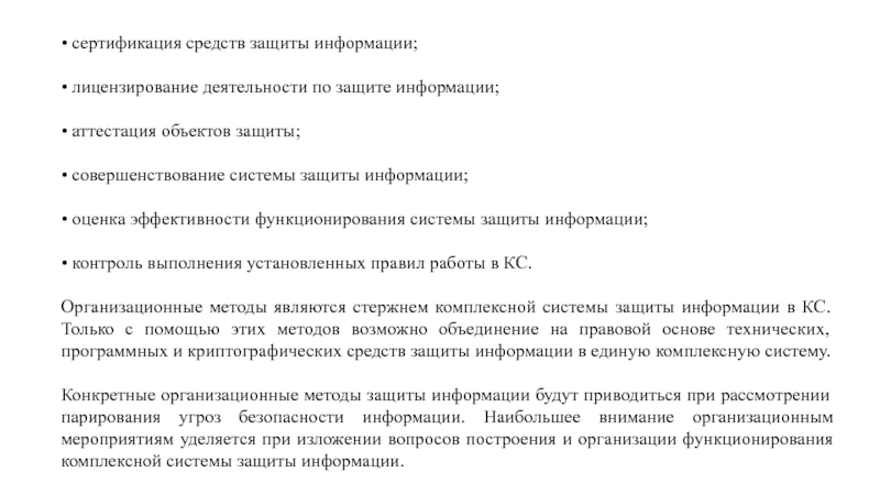 Конкретные организационные методы защиты информации будут приводиться при рассмотрении парирования угроз безопасности информации. Наибольшее внимание организационным мероприятиям уделяется при изложении вопросов построения и организации функционирования комплексной системы защиты информации.