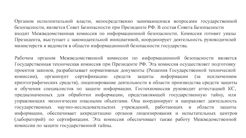 Рабочим органом Межведомственной комиссии по информационной безопасности является Государственная техническая комиссия при Президенте РФ. Эта комиссия осуществляет подготовку проектов законов, разрабатывает нормативные документы (Решения Государственной технической комиссии), организует сертификацию средств защиты информации (за исключением криптографических средств), лицензирование деятельности в области производства средств защиты и обучения специалистов по защите информации. Гостехкомиссия руководит аттестацией КС, предназначенных для обработки информации, представляющей государственную тайну, или управляющих экологически опасными объектами. Она координирует и направляет деятельность государственных научно-исследовательских учреждений, работающих в области защиты информации, обеспечивает аккредитацию органов лицензирования и испытательных центров (лабораторий) по сертификации. Эта комиссия обеспечивает также работу Межведомственной комиссии по защите государственной тайны.