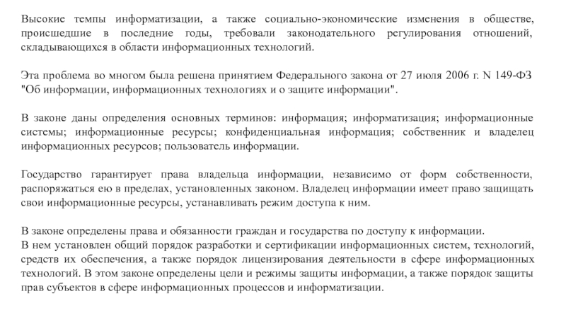 В нем установлен общий порядок разработки и сертификации информационных систем, технологий, средств их обеспечения, а также порядок лицензирования деятельности в сфере информационных технологий. В этом законе определены цели и режимы защиты информации, а также порядок защиты прав субъектов в сфере информационных процессов и информатизации.