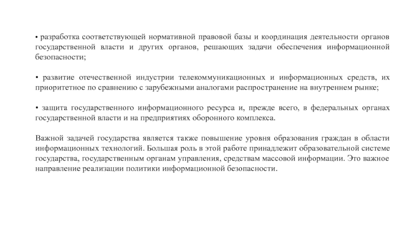 В этих документах определены важнейшие задачи государства в области информационной безопасности: