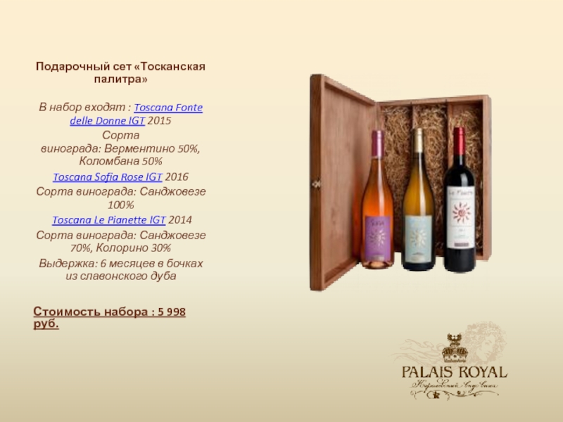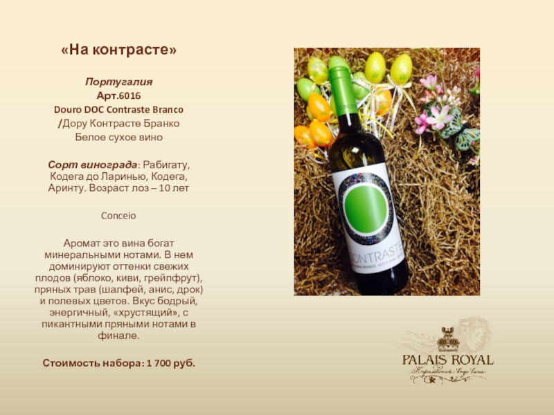 Вино бледно-золотистого цвета, с ароматом яблок, лайма и резеды. Вкус очень, живительный, с приятной кислотностью