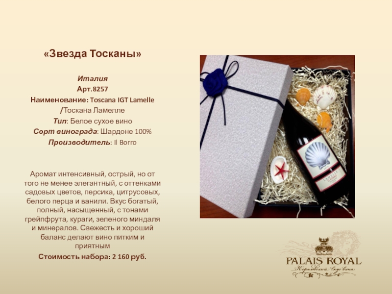 не менее элегантный, с оттенками садовых цветов, персика, цитрусовых, белого перца и ванили. Вкус богатый, полный, насыщенный, с тонами грейпфрута, кураги, зеленого миндаля и минералов. Свежесть и хороший баланс делают вино питким и приятным